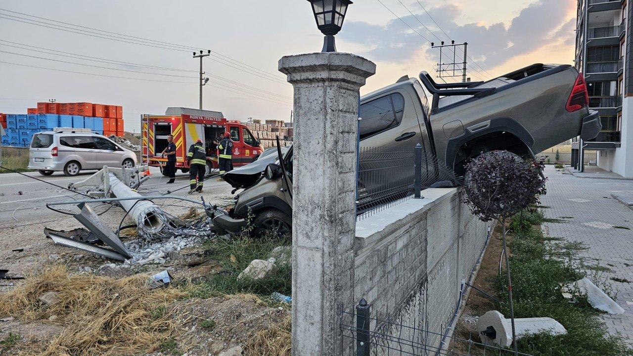 Konya'da beton direğe çarptıktan sonra savrulup, sitenin bahçe duvarında asılı kalan kamyonetin sürücüsü Selahattin Günay, yaralandı.