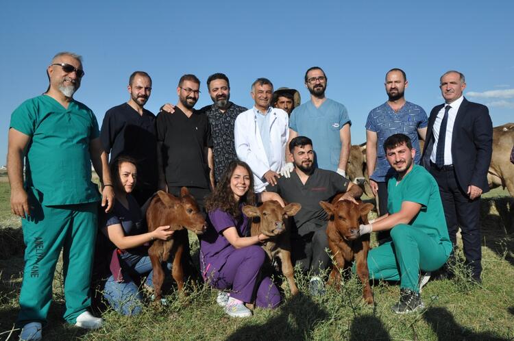 ABD'nin Teksas eyaletinden 'Beefmaster ve Zavot Sığır Irklarında Embriyo Transferi' projesi kapsamında Kars Kafkas Üniversitesi Veterinerlik Fakültesi'ne 2022 Ocak ayında getirilen embriyoların transfer edildiği inekler, geçen hafta 3 buzağı doğurdu. Bir haftalık olan buzağılar anneleriyle ilk kez dışarı çıkarıldı. Buzağıların doğum ve bakımında görev alan doktora öğrencileri, cep telefonlarıyla görüntü aldı.