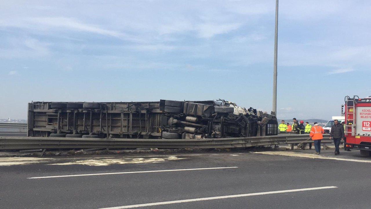 Kaza, saat 12.00 sıralarında Kuzey Marmara Otoyolu bağlantı yolunun Organize Sanayi Bölgesi mevkisinde meydana geldi. Osmangazi Köprüsü yönüne seyir halinde olan Müfik Atacan idaresindeki 45 AKH 249 plakalı TIR, bariyerleri aşarak karşı şeride geçtikten sonra devrildi.