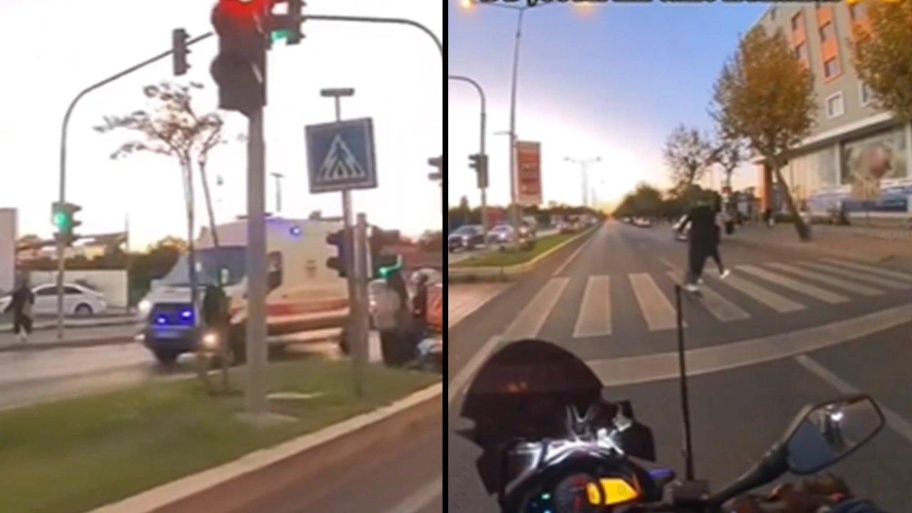Kırmızı ışıklarda bir genç yolun karşısına geçmek istediği o anda sirenleri çalan bir ambulans hızla ilerledi. Ambulansın kendisine çarpmasından saniyelerle kurtulan çocuk bu kez de yaya geçidinden yolun karşısına geçmeye çalıştı.