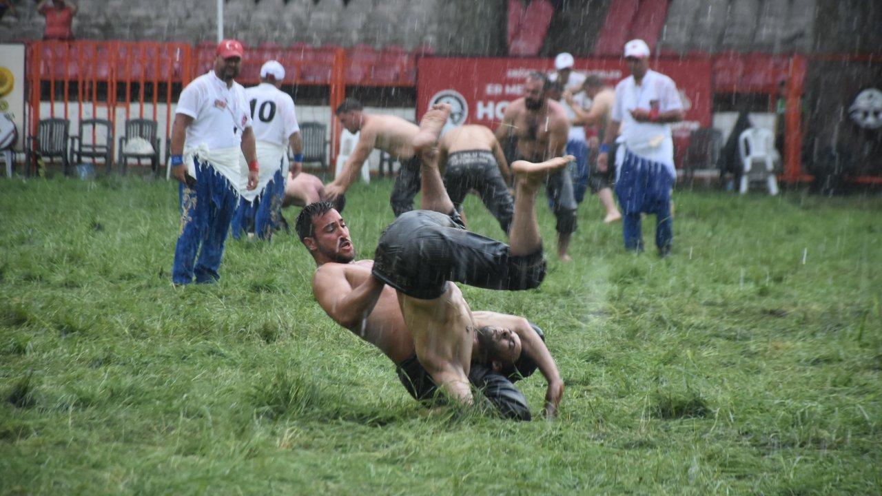 Sağanağa yakalanan güreşçiler mücadeleye devam ederken, zor anlar yaşadı. Güreşler sırasında yağmur zaman zaman hızını arttırırken, pehlivanlar zorlu mücadelelerini sürdürdü.