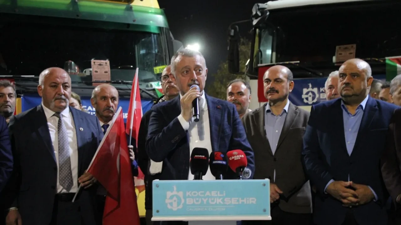 Kocaeli Büyükşehir Belediyesi tarafından Gazze'ye gönderilmek üzere hazırlanan insani yardım tırları, düzenlenen törenin ardından dualarla yola çıktı.