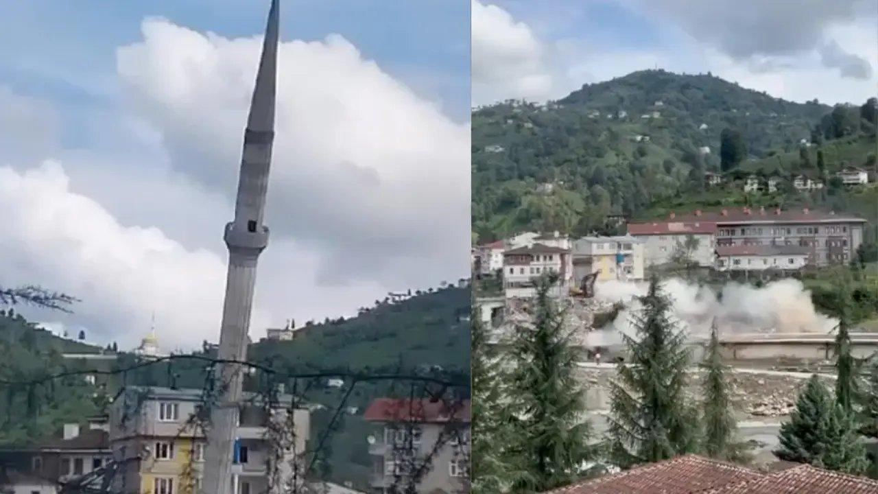 Rize'nin Güneysu ilçesinde kentsel dönüşüm kapsamında yıkılan Köprübaşı Camisi'nden kalan minarenin kontrollü olarak yıkımı tamamlandı. Toz bulutuna neden olan yıkım, çevredekiler tarafından cep telefonu kamerası ile kaydedildi.