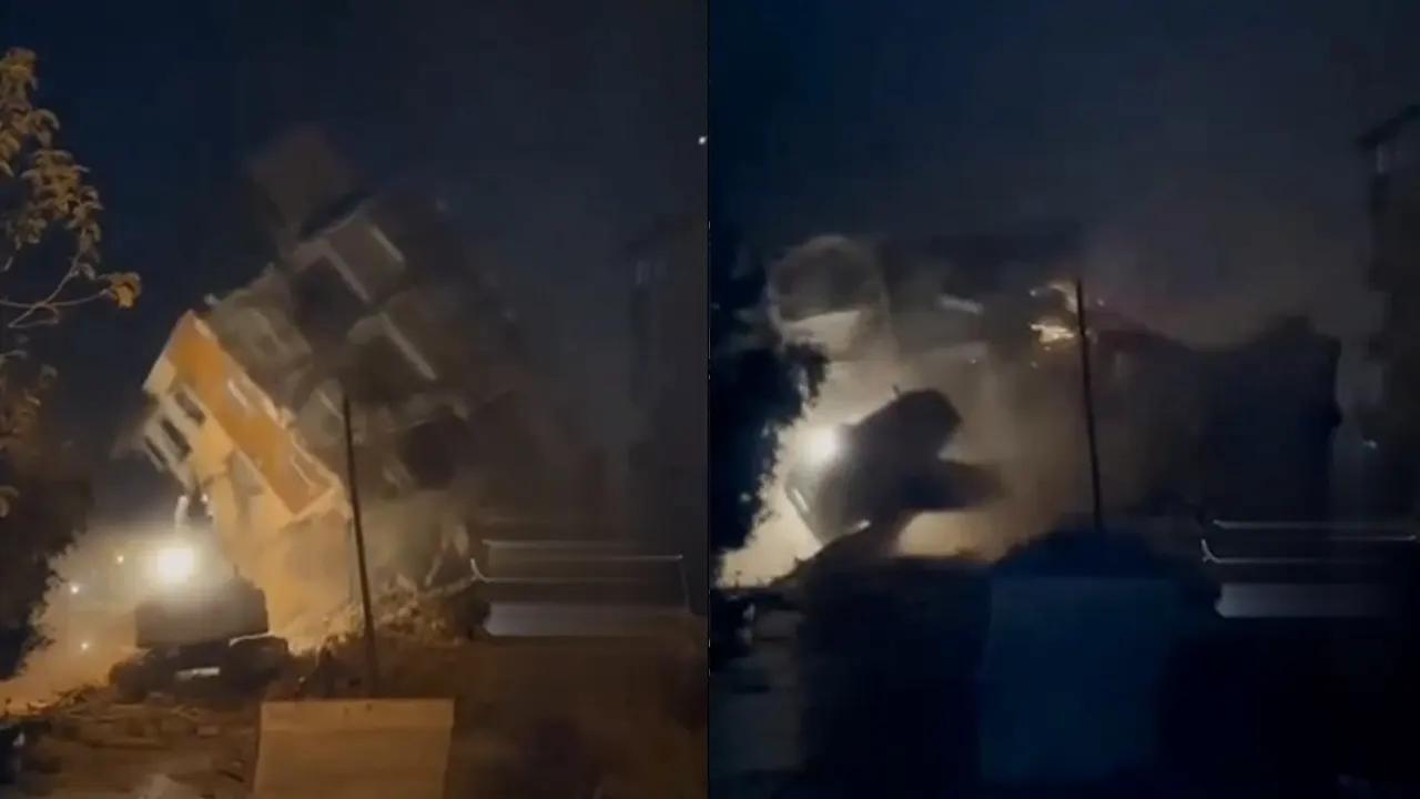Hatay'da deprem nedeniyle ağır hasar alan 6 katlı bina, yıkım sırasında iş makinesinin üzerine çöktü, operatör hafif şekilde yaralandı. O anlar cep telefonu kamerasıyla kaydedildi.