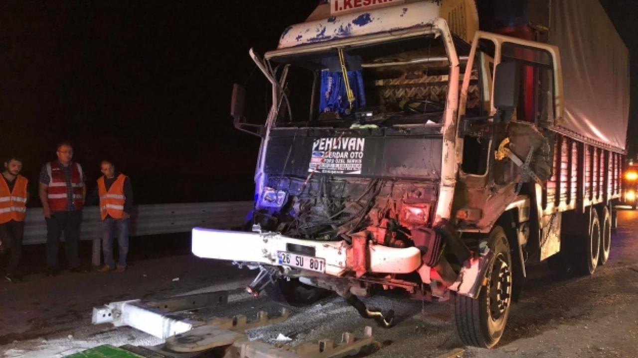 Kazada iki kamyonun sürücüsü de yaralandı. Saat 00.15 meydana gelen kazada iddiaya göre, İbrahim Keskin yönetimdeki 26 SU 801 plakalı kamyon aynı istikamette ilerleyen 34 GGC 68 plakalı kamyona arkadan çarptı. Çarpmanın etkisiyle İbrahim Kesin araçta sıkıştı. İhbar üzerine itfaiye, sağlık ve polis ekipleri sevk edildi.