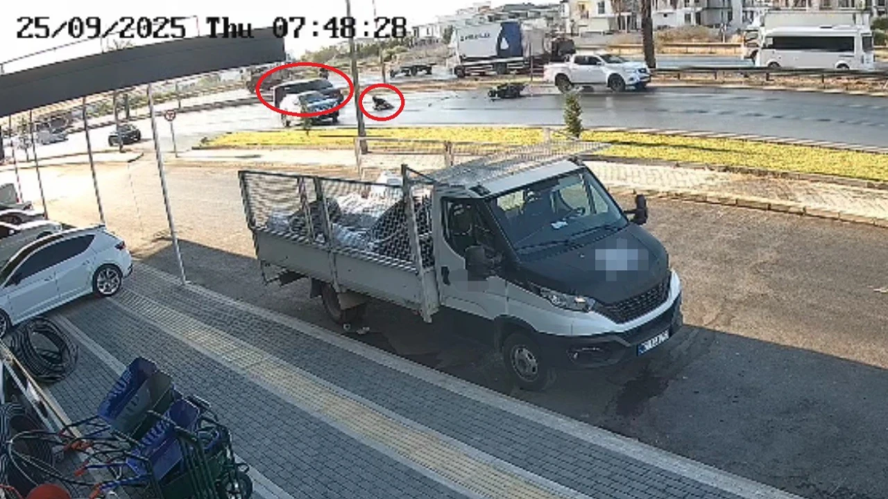 Kaza anı güvenlik kamerasına saniye saniyesine yansırken, otomobilin çarpmasının ardından yolda sürüklenen motosiklet savrulurken, yerdeki sürücü arkadan gelen bir aracın altında kalmaktan sürücünün dikkati sayesinde son anda kurtuldu.