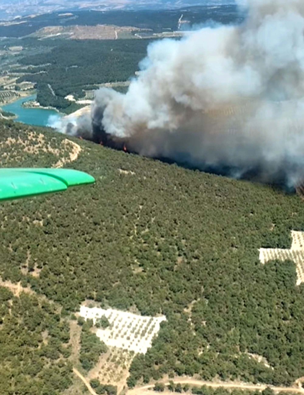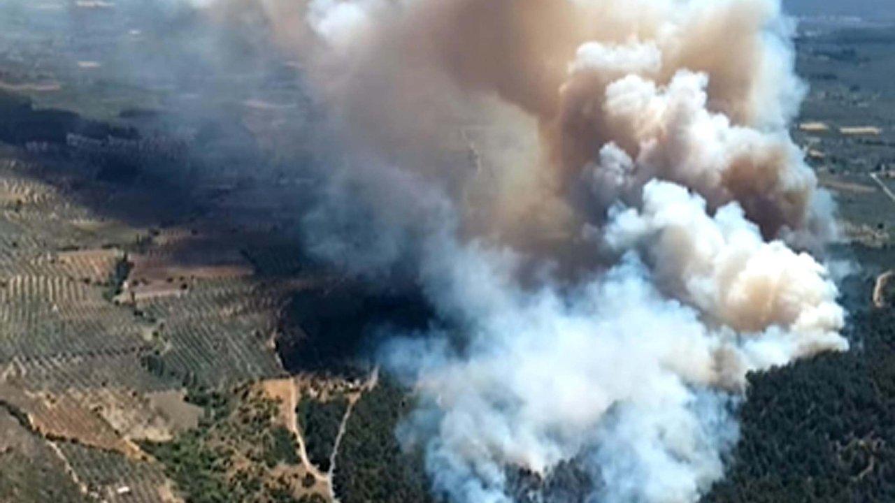 Manisa'nın Soma ilçesinde orman yangını çıktı. Bölgeye yönlendirilen ekipler, alevlere havadan ve karadan müdahalede bulunuyor.