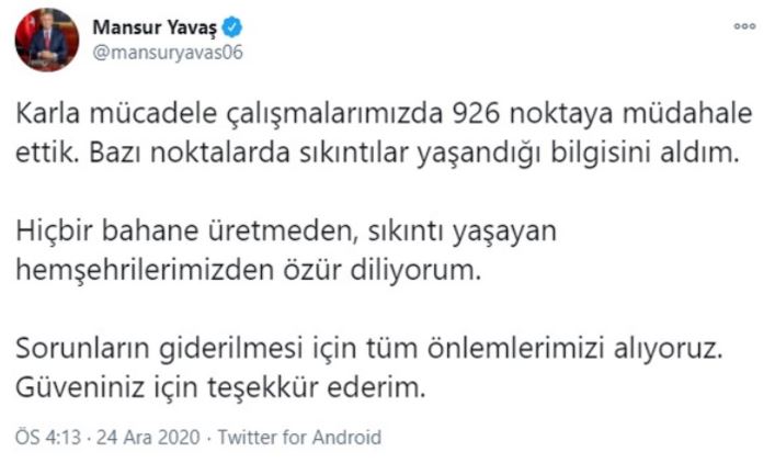 Vatandaşların cep telefonu kameralarına yansıyan anlar için Mansur Yavaş sosyal medya hesabından açıklama yaparak, "Karla mücadele çalışmalarımızda 926 noktaya müdahale ettik. Bazı noktalarda sıkıntılar yaşandığı bilgisini aldım. Hiçbir bahane üretmeden, sıkıntı yaşayan hemşehrilerimizden özür diliyorum. Sorunların giderilmesi için tüm önlemlerimizi alıyoruz. Güveniniz için teşekkür ederim" dedi.
