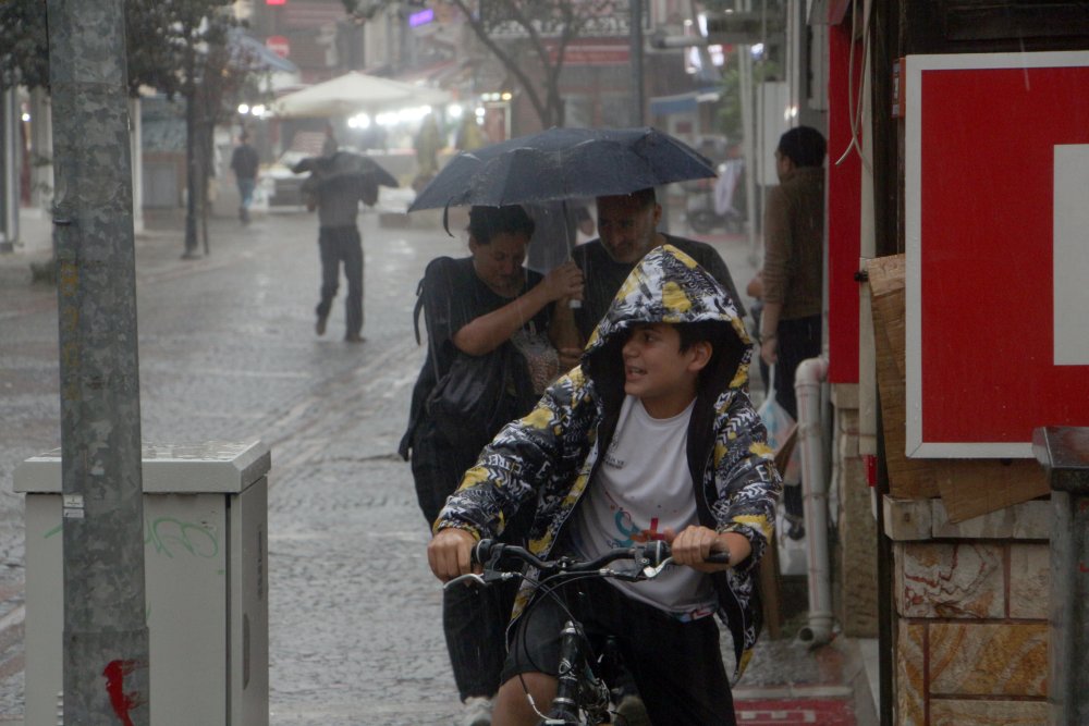 Yer yer kuvvetli şekilde süren yağışa hazırlıksız yakalanan vatandaşlar işletmelere ve saçak altlarına saklandı.