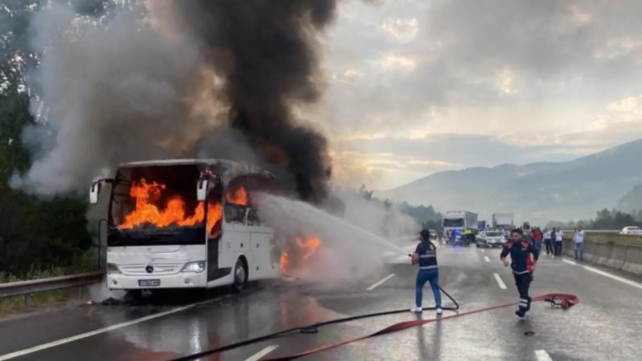 Otobüsü emniyet şeridine çeken şoför, araçta bulunanları tahliye etti. İhbar üzerine olay yerine çok sayıda itfaiye ekibi sevk edildi.