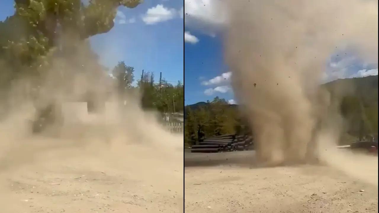 Bartın'ın Ulus ilçesinde bulunan orman deposundaki toprak alanda hortum çıktı. İşçilerin büyük panik yaşadığı hortum, cep telefonu ile görüntülendi.