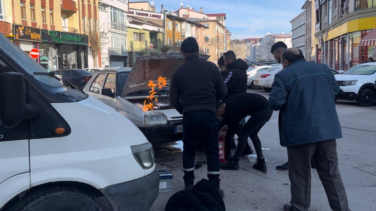 Sivas'ta arızalanan bir otomobil alev aldı. Otomobil sahibinin yangını, montu ile söndürmeye çalışması cep telefonu kamerası ile kaydedildi.