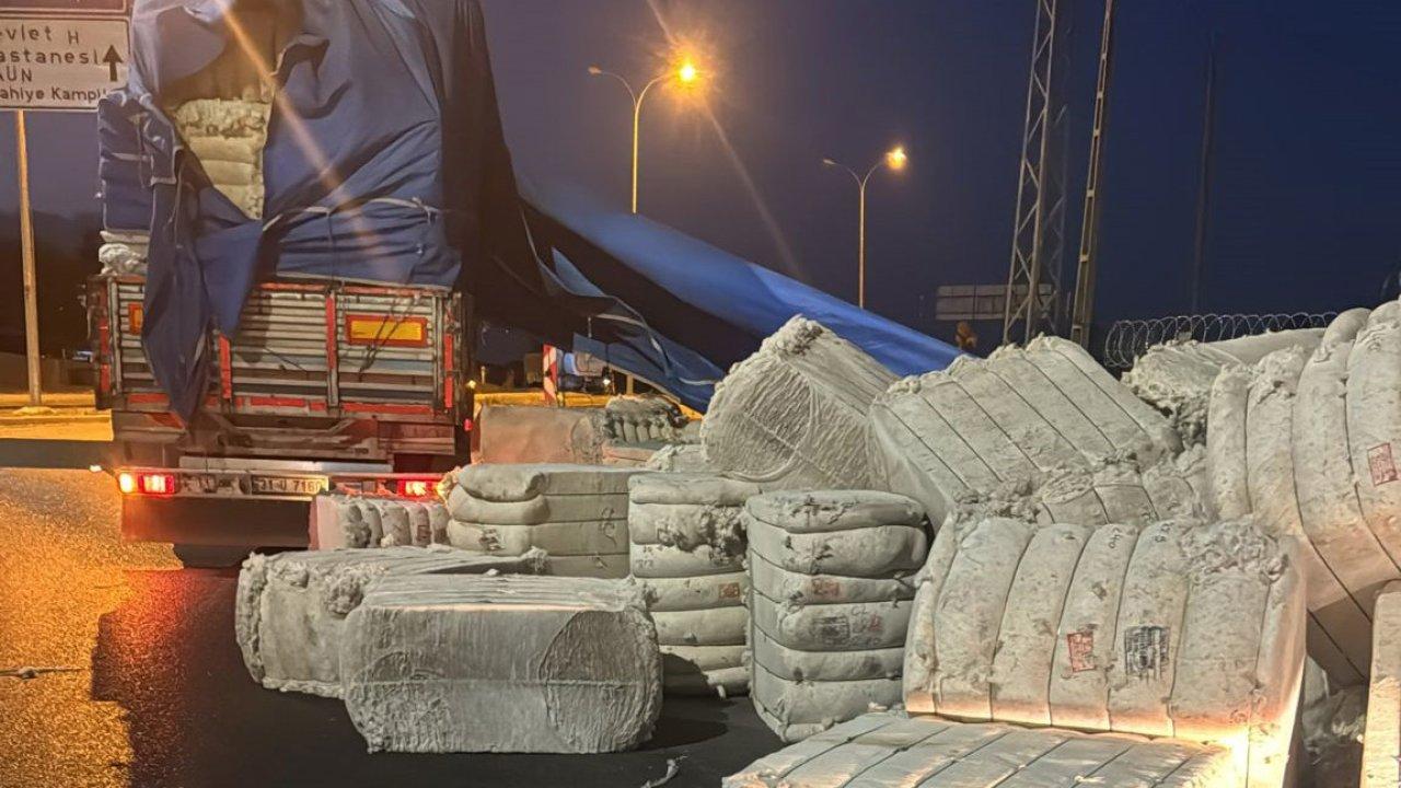 Gaziantep'in Islahiye ilçesinde TIR'ın dorsesindeki pamuk balyaları, yola savruldu. Kapanan yol, balyaların kaldırılması ile açıldı.