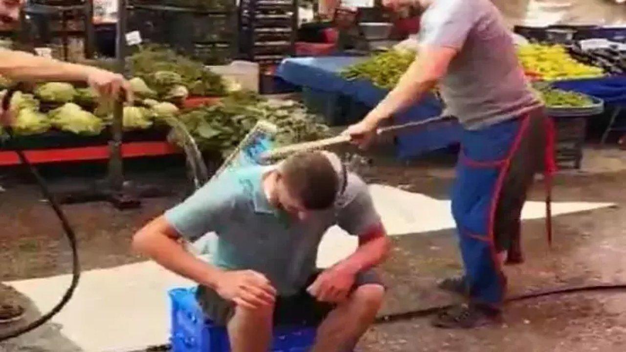 Eskişehir'de 36 dereceyi aşan sıcak havadan bunalan bir pazarcıyı, kurdukları semt pazarında esnaf arkadaşları hortumla su tutarak yıkadı. Şampuan döküp adeta duş alan pazarcının hallerini, arkadaşları cep telefonuyla çekip, sosyal medyada paylaştı.
