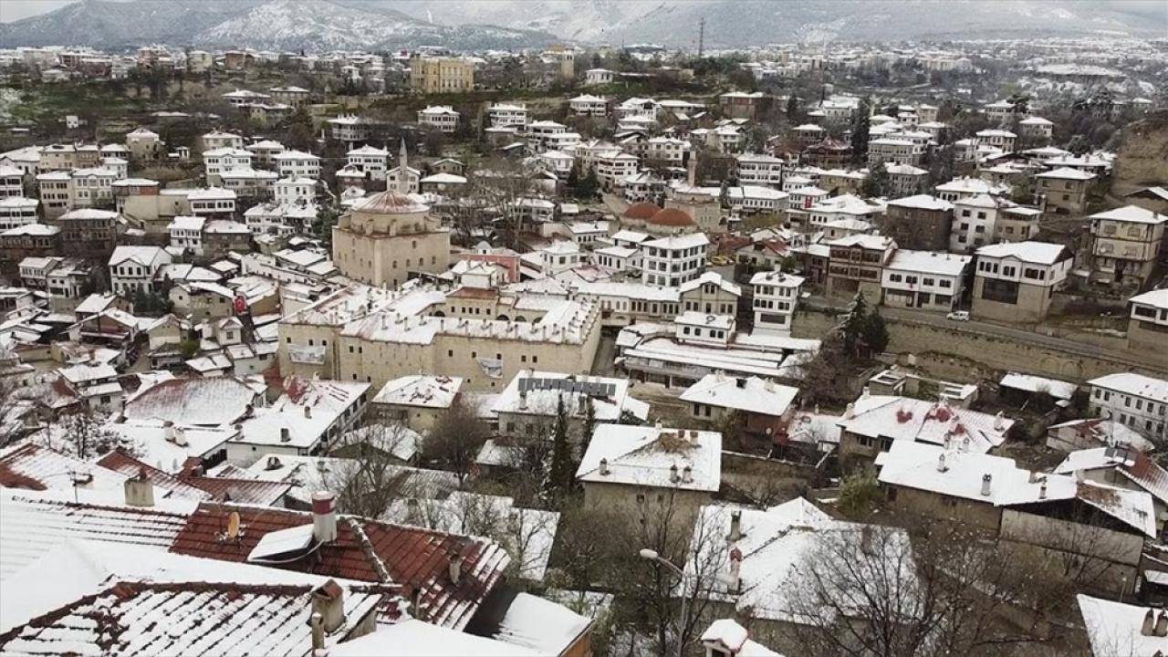 Safranbolu'da dün akşam saatlerinde başlayan yağışın ardından Osmanlı dönemi han, hamam, cami, çeşme ve konaklar karla kaplandı.