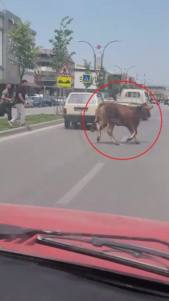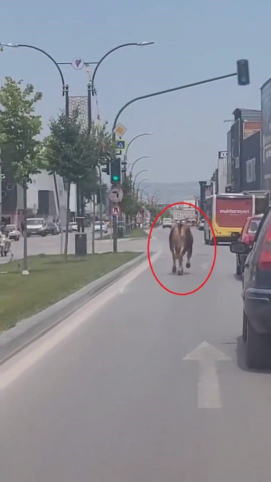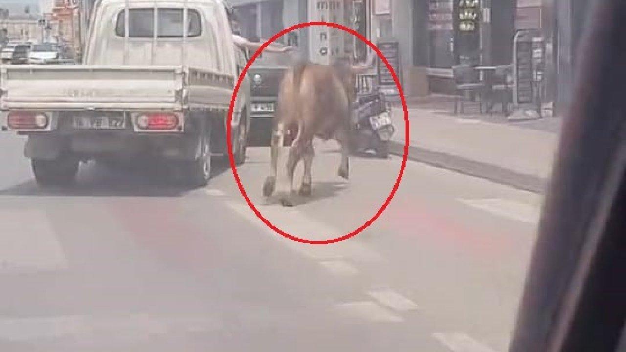 Olay, Mahmudiye Mahallesi Ertuğrulgazi Caddesi'nde meydana geldi. Hayvan pazarından alınan kurbanlık inek, eve götürüldüğü sırada sahibinin elinden kurtularak kaçtı. Kaldırımdan yola inerek, otomobillerin ortasında koşmaya başlayan inek, trafiği birbirine kattı. Sahibinin yakalamaya çalıştığı ineğin önü kamyonetle kesildi. İnek kaçmaya devam ederken, o anlar çevredekiler tarafından cep telefonu ile görüntülendi.