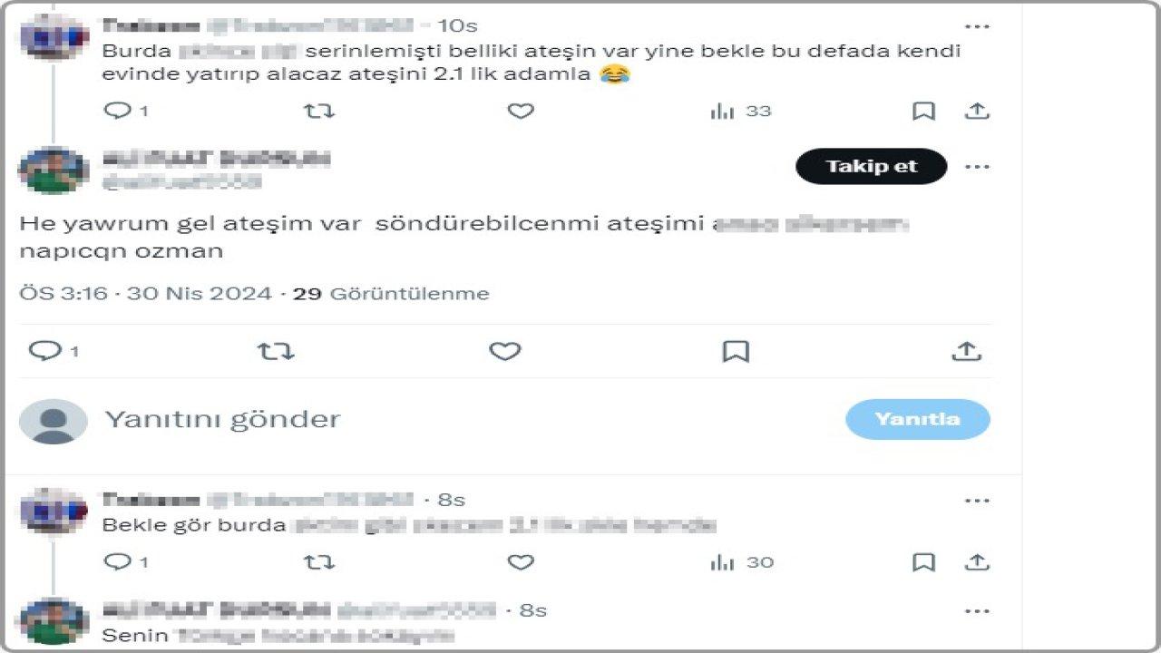 Taraftar gruplarını tahrik edici, aşağılayıcı ve küfür içerikli paylaşımlar yapan sosyal medya hesaplarında yapılan araştırmada, profil sahiplerinin gerçekte A.F.D., S.E., G.G., M.E.Ö., S.N., H.A., G.K. ve F.D. olduğunu belirledi. 8 kullanıcı, adreslerinde yakalanıp, haklarında adli ve idari işlem başlatıldı.