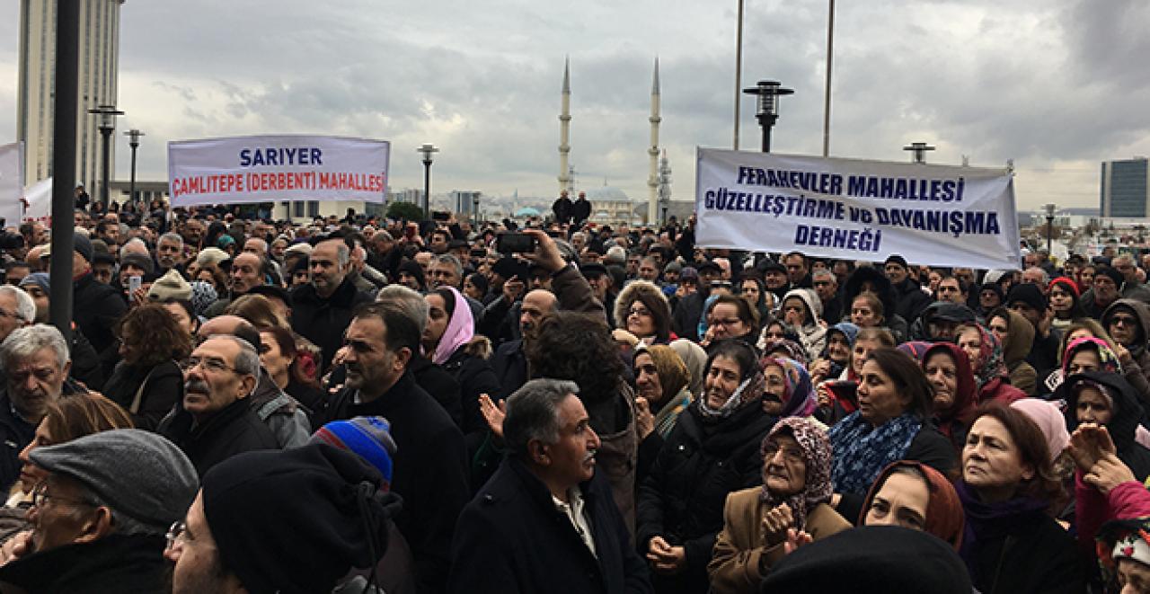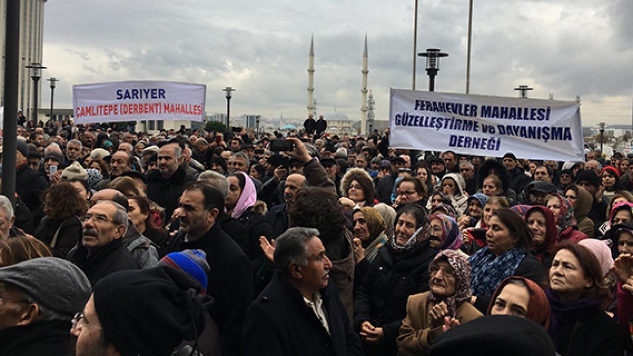 Ertelemenin ardından Sarıyer Mahalleler Birliği olarak çalışmalara başlayarak konuyu Sarıyer Belediye Meclisi'ne taşıdıklarının altını çizen Kaya, "Yasanın uygulanabilmesi ve hukuki güvence için gerekli olan İmar Islah Planları'nın yapılması ve yasanın uygulanması konusunda ilçe belediye meclisinden oy birliği ile karar alınmasını sağladık. Bunun üzerine, 2016 yaz aylarından itibaren başlanarak Sarıyer mahallelerinde Islah İmar Planı çalışmaları başladı. Mahalleler düzeyinde hazırlanan ıslah imar planları Sarıyer Belediye Meclisi'nden geçerek, İstanbul Büyükşehir Belediye Meclisi gündeminde görüşülmek üzere, Büyükşehir Belediye Başkanlığına sunuldu. Planları meclise dahi sokmadılar. Bunun üzerine Sarıyer Mahalleler Birliği olarak konuyla ilgili toplu dilekçe verdik. Sarıyer Belediyesi, 'yetersiz/sebepsiz ve de hukuka aykırı' bu işlemin iptali için dava açtı" ifadelerini kullandı. Otobüslerle Sarıyer'den mahkeme binasına gelen mahalleli, açıklamanın ardından geldikleri otobüslerle yine yaşadıkları