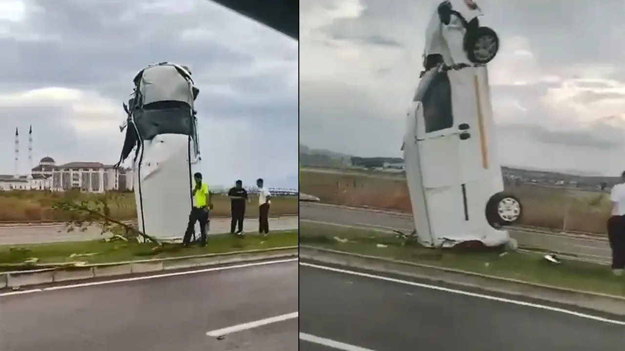 DHA- Bursa'da, yağmur sebebiyle kayganlaşan yolda sürücüsünün direksiyon hakimiyetini kaybettiği kamyonet savrulup, refüjde dik durdu. Sürücü F.D.'nin kamyonet içerisinde sıkıştığı kaza, yoldan geçen diğer sürücüler tarafından cep telefonu kamerasıyla görüntülendi.