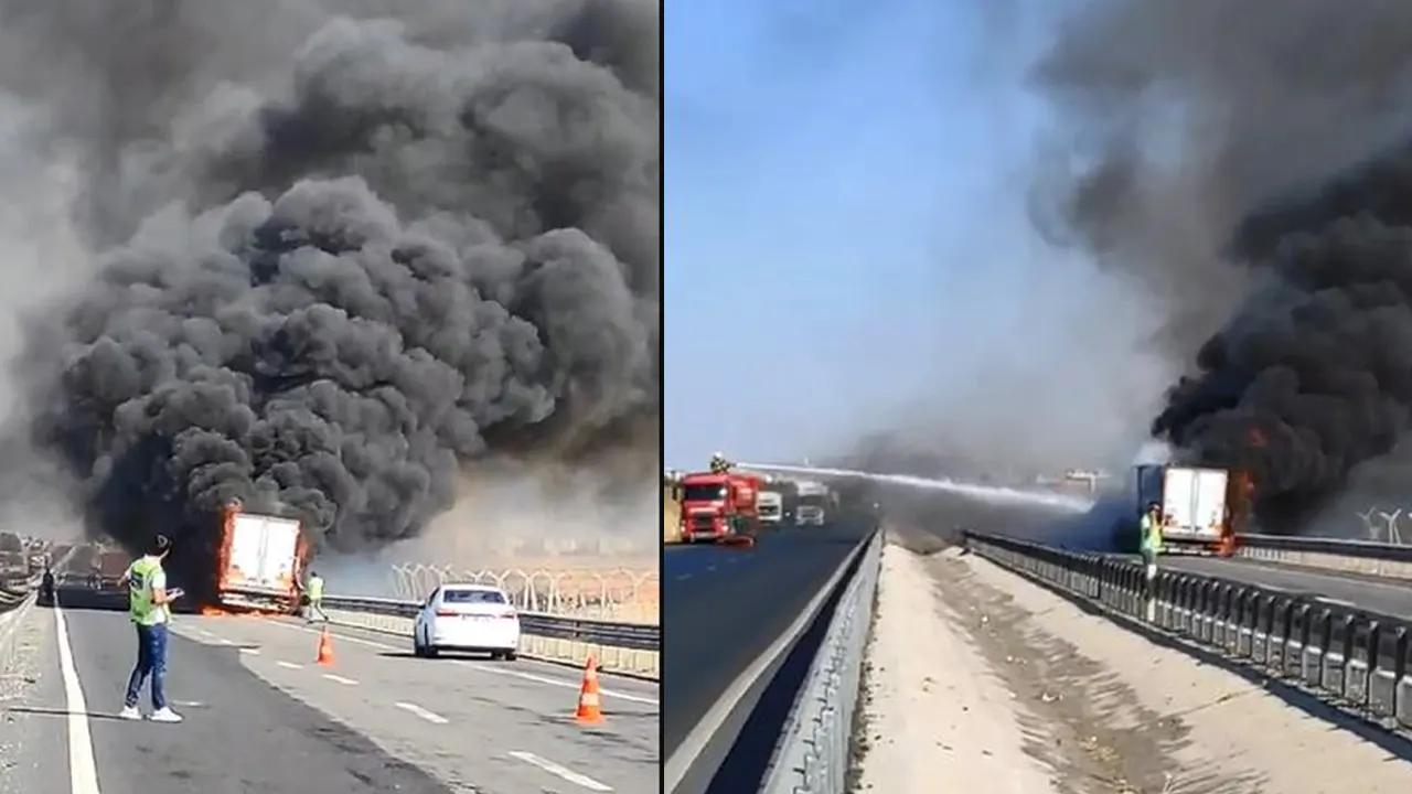 Mardin'in Nusaybin ilçesinde seyir halindeyken alev alan şekerleme yüklü TIR'ın dorsesi yandı. Yangın, cep telefonu kamerasıyla kayda alındı.