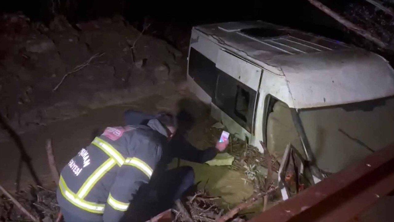 AA - Alınan bilgiye göre, plakası ve sürücüsü öğrenilemeyen minibüs, sağanak sonrası oluşan sele kapılarak yol kenarındaki dereye düştü.