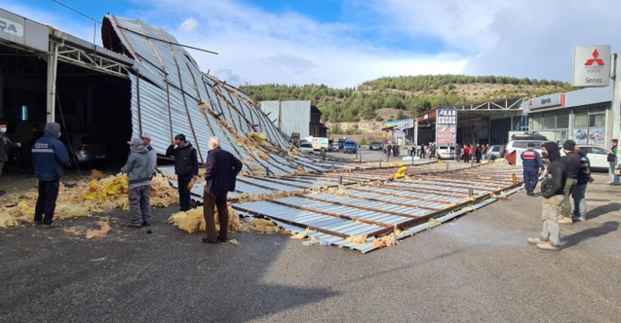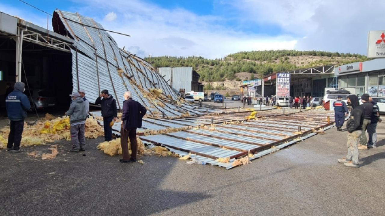 Karabük’te yağmurla birlikte etkisini gösteren fırtına, Karabük’te etkili oldu. Şiddetli rüzgar nedeniyle Kemal Oyman Sanayi Sitesi’ndeki işyerlerinin çatısı uçtu.
