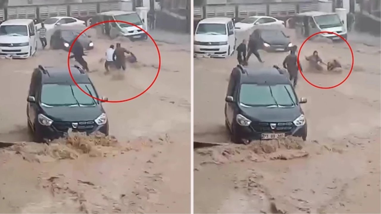 Cizre ilçesindeki Cudi Mahallesi'nde etkili olan yağış nedeniyle 1'i çocuk 2 kişi, sel sularına kapıldı. Çevredekilerin yardımıyla sudan çıkarılan 2 kişinin sağlık durumunun iyi olduğu öğrenildi. O anlar, cep telefonu kamerasına yansıdı.