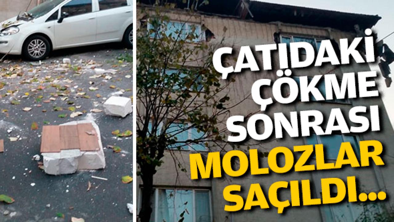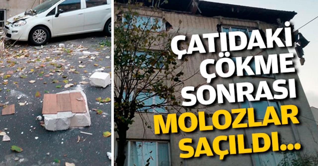 Şişli'ye bağlı Gülbağ Mahallesi'ndeki 6 katlı binanın çatısında yaşanan çökme sonrası molozlar sokağa saçıldı.