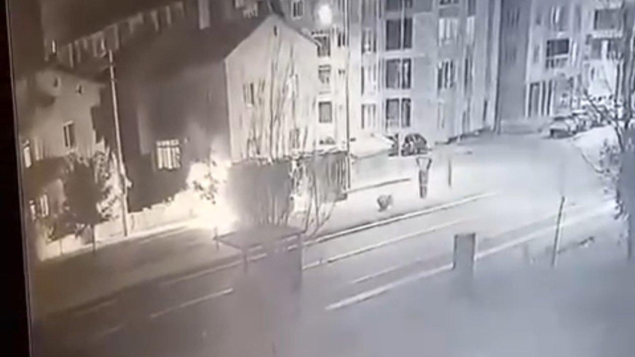 TIR, vinçle yoldan kaldırılırken, kaza, çevredeki bir iş yerinin güvenlik kamerasına yansıdı.