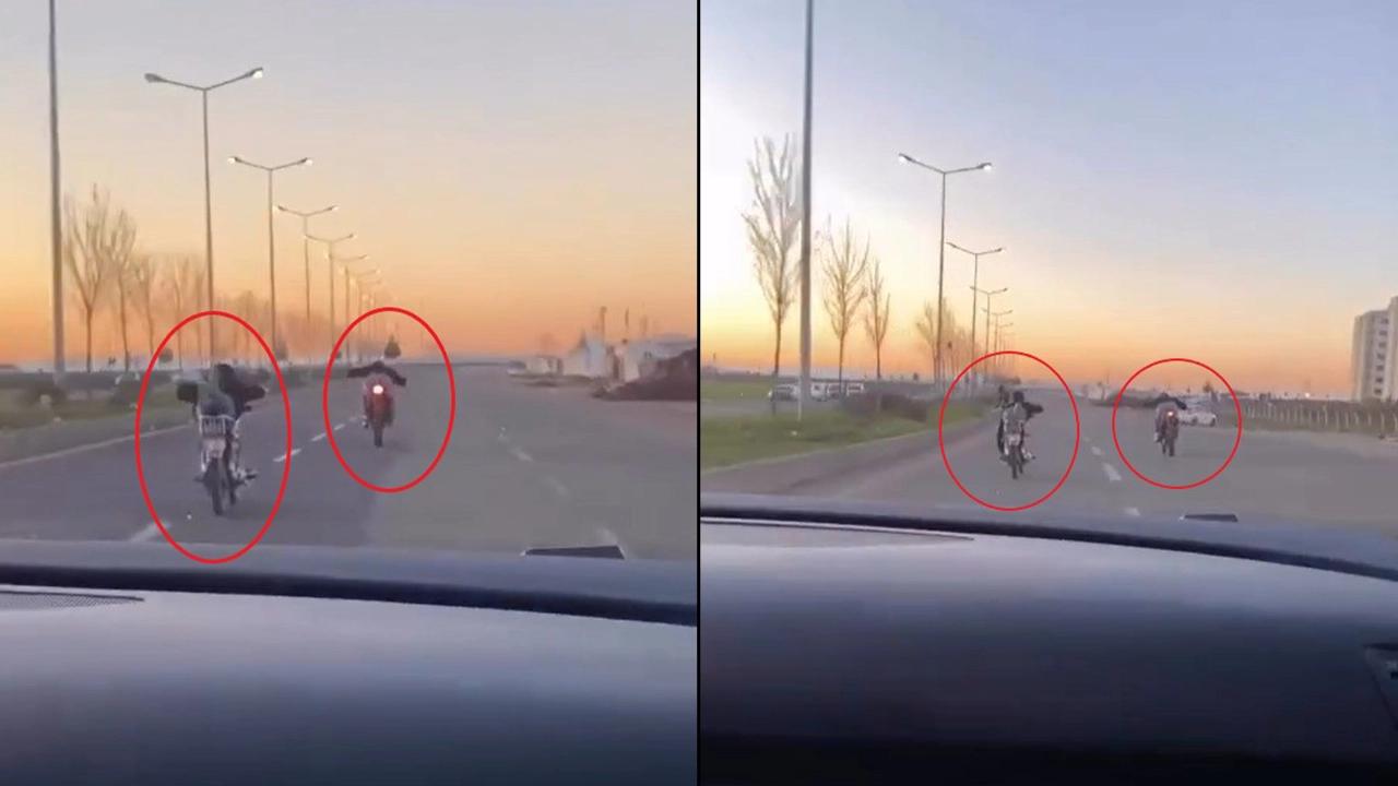 Diyarbakır'da yüzüstü yatarak motosiklet kullanan kasksız 2 sürücünün tehlikeli yolculuğu kameraya yansıdı.