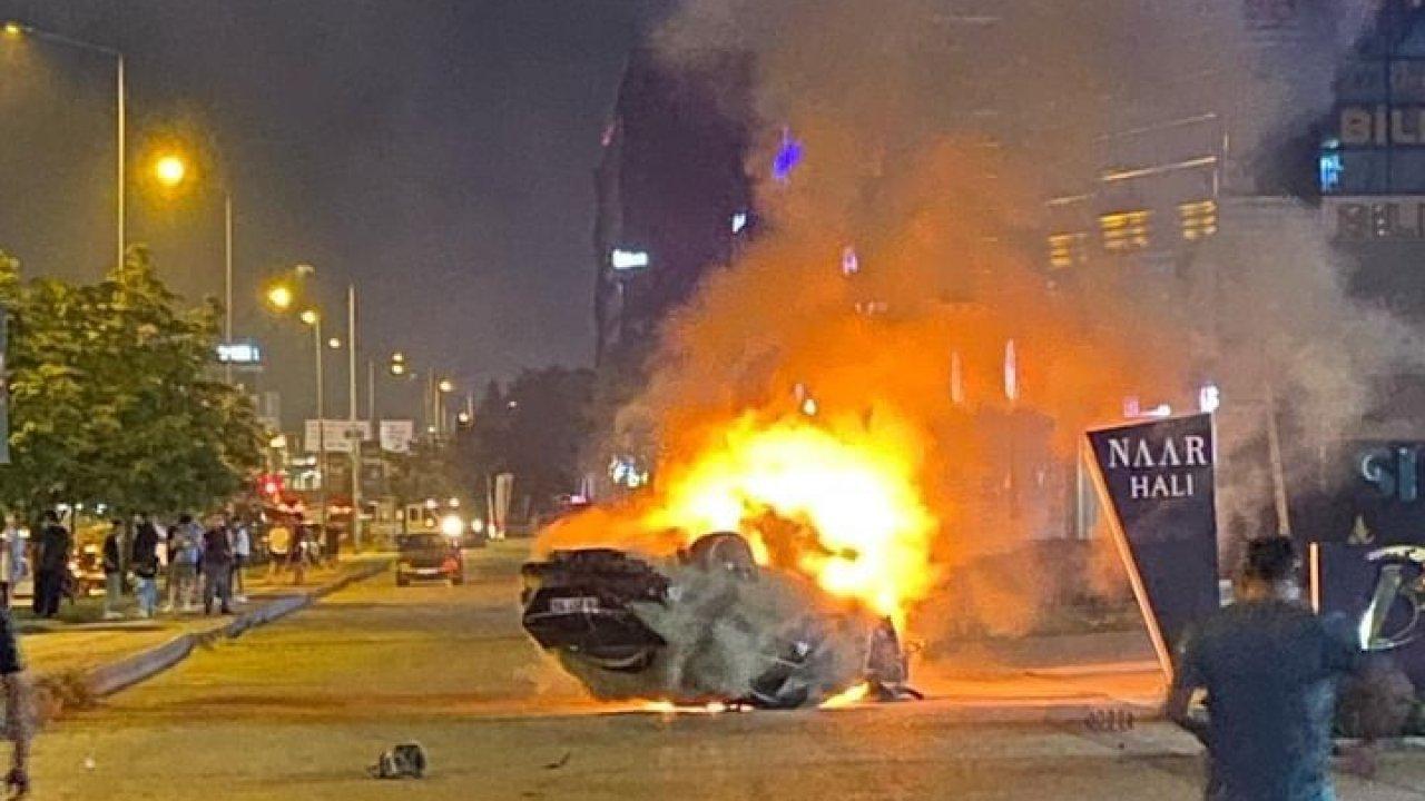 Bursa'da otomobil, önce refüje ardından ağaç ve aydınlatma direğine çarpıp takla attı. Kazada sürücü Burak K. ile araçtaki kadın yaralandı. Metrelerce sürüklenen otomobil alev alıp yanarken, araç kullanılamaz hale geldi.