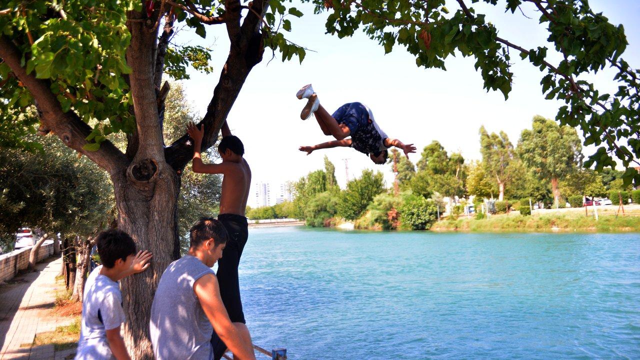 Adana'da sıcaktan bunalan çocuklar, tehlikeye aldırış etmeden her yıl onlarca kişinin boğulduğu sulama kanallarında serinliyor. Köprü ve korkuluklardan sulama kanalına giren çocuklar, bu kez de ağaçlara tırmanıp suya atladı.