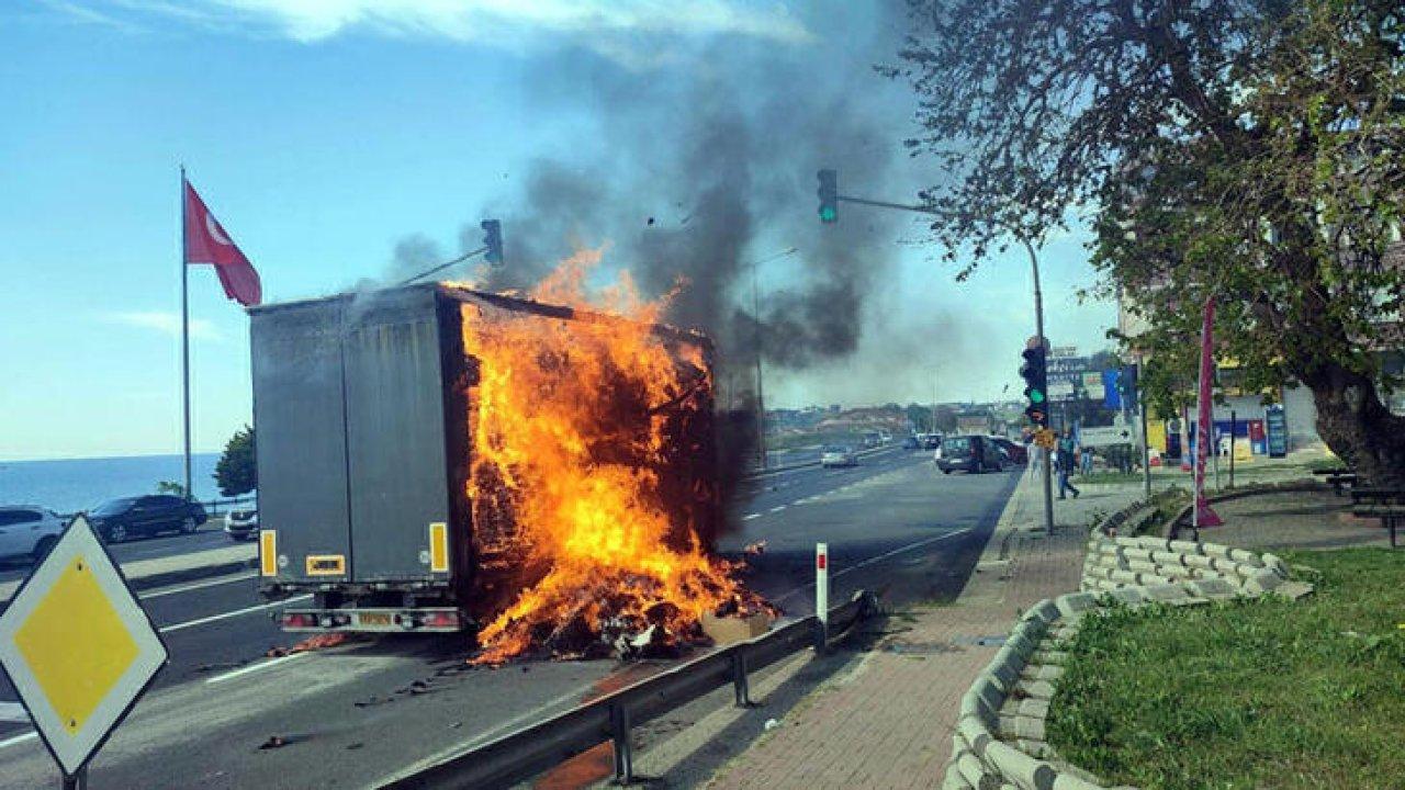 DHA- Kazakistan'an aldığı tekstil ürünlerini Yunanistan'a götüren Yanis Kapatinski (57) yönetimindeki EKA-5874 plakalı TIR'ın dorsesinde, Tekirdağ'ın Marmaraereğlisi ilçesinde seyir halindeyken yangın çıktı.