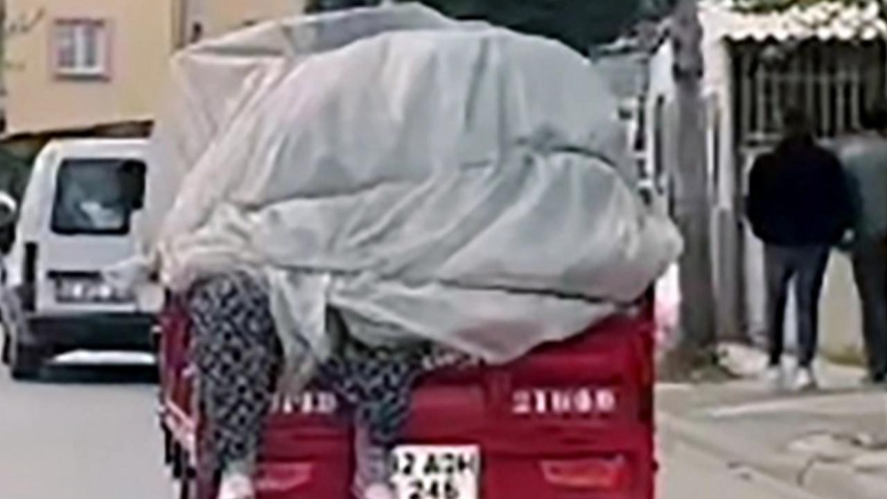Bahçelievler Mahallesi 109 cadde üzerinde dün seyir halindeki üç tekerlekli elektrikli bisikletin kasasında seyahat eden kadın, görenleri şaşırttı. Ayaklarını kasadan sarkan kadının, gövdesi ve baş kısmını ise bir kısım eşya ile birlikte naylona sarılıp, bağlanmış vaziyette yolculuk yaptığını görenler bu anları cep telefonu kamerasıyla kaydetti.