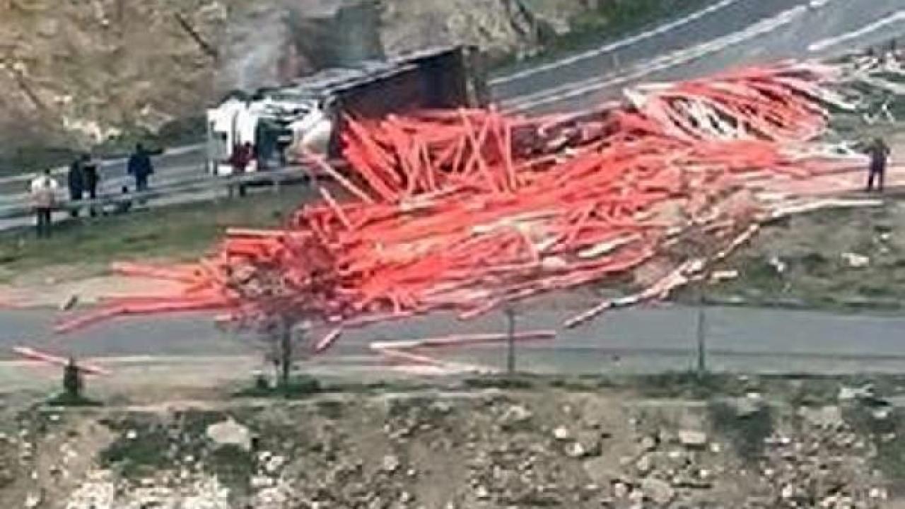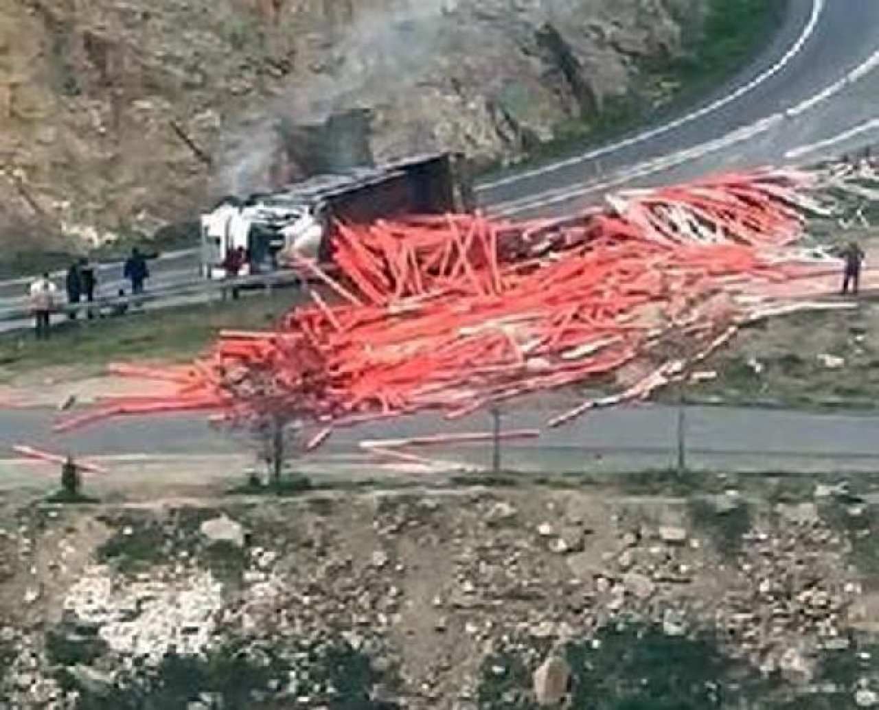 Tekin YALÇINKAYA/ ELAZIĞ, (DHA)- ELAZIĞ’da virajı alamayarak devrilen boru yüklü kamyonun sürücüsü yaralandı.