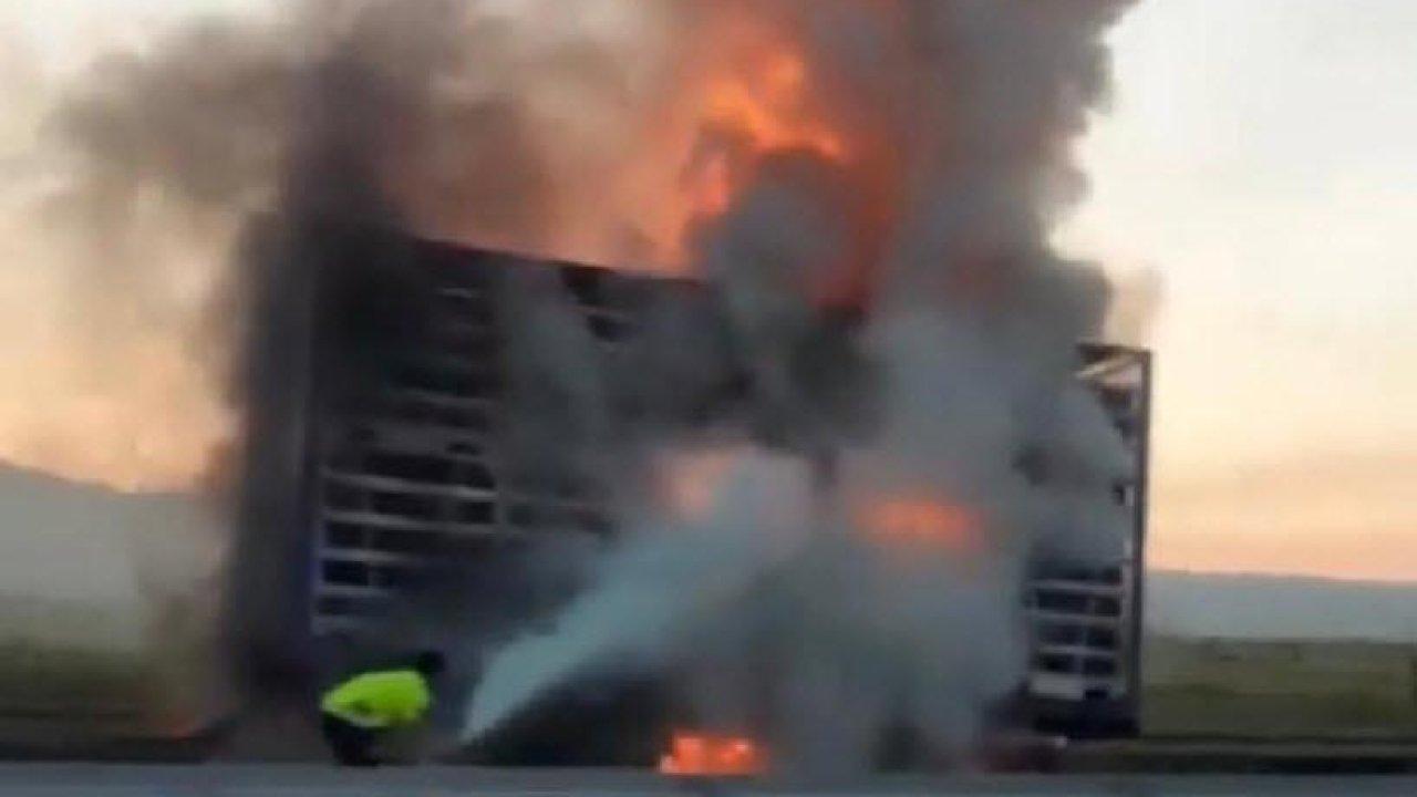DHA- Manisa'nın Alaşehir ilçesinde seyir sırasında alev alan kamyondaki 1500 tavuk öldü.