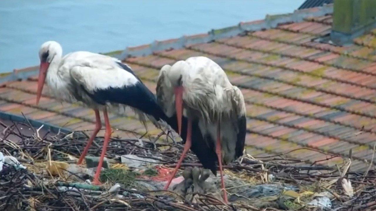 Bu yıl içinde 4 tane yavrusu olan Yaren ve Nazlı leyleğin soğuk ve yağmurlu havada nöbet değişimi yaparak yavrularını koruduğu anlar kameralara yansıdı.