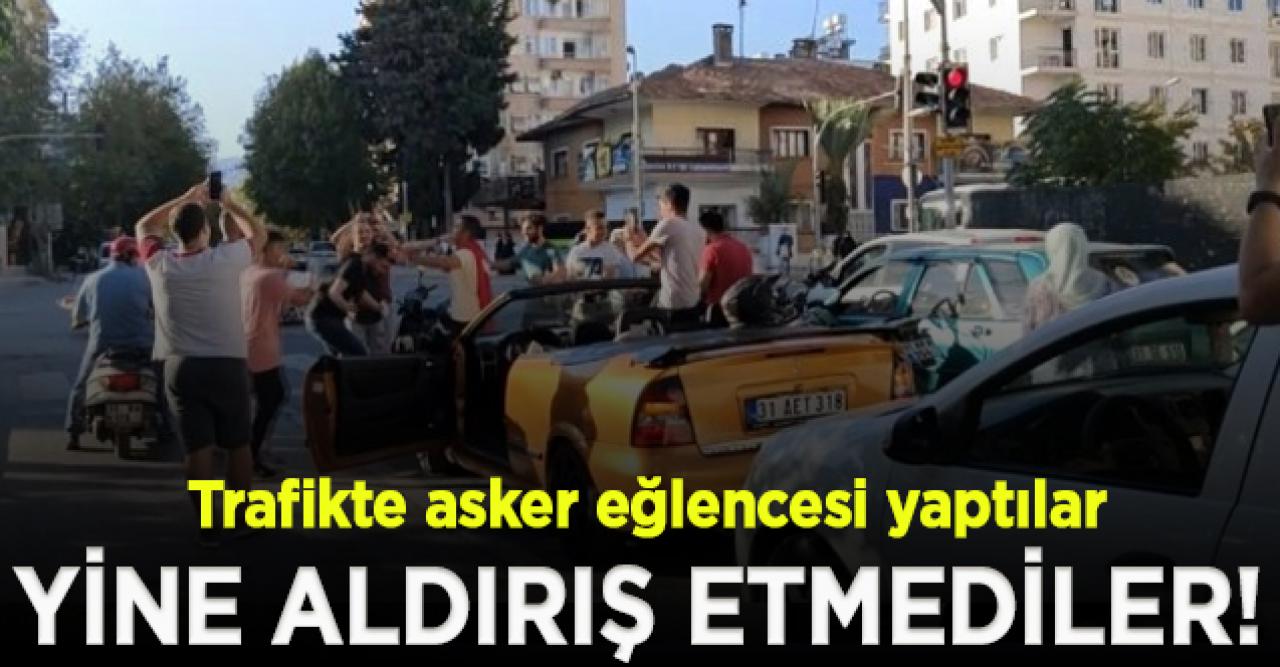 Hatay'ın Antakya ilçesinde asker uğurlama konvoyu düzenleyen bir grup, kentin en işlek caddelerinden olan Cumhuriyet Caddesinde trafik ışıklarını fırsat bildi. Kırmızı ışığın yanmasıyla beraber arabalardan inen grup, askere gidecek olan arkadaşıyla beraber asker eğlencesi yaptı.