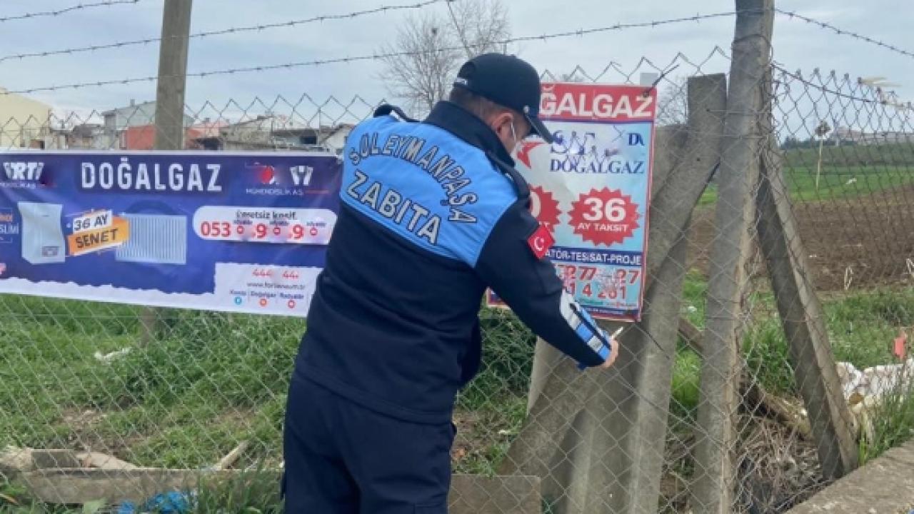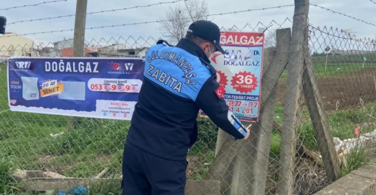 İlçe genelinde izinsiz reklam ve ilan görsellerinin asılması ile ilgili uygulama yürüten Süleymanpaşa Belediyesi Zabıta Müdürlüğü ekipleri, gerekli izinler alınmadan uygun olmayan yerlere asılan görselleri toplayarak imha etti. Konuyla ilgili olan sorumlulara ulaşan Zabıta ekipleri, reklam ve ilan afişlerinin Süleymanpaşa Belediyesinden izin alınarak, belediyenin gösterdiği alanlara asılması gerektiği bilgisini paylaştı. Kabahatler Kanunu’nun 42. Maddesi uyarınca izinsiz afiş, reklam ve ilan asmanın yasak olduğu belirtilerek kanunun gerektirdiği işlemler sorumlu kişilere uygulandı. Yapılan açıklamada, çok sayıda uygunsuz ilanın toplanarak temizlendiği, ilan ve reklam afişlerini asmak isteyenlerin gerekli izinleri almalarının kanuni zorunluluk olduğu, aksi takdirde Kabahatler Kanunu’nun 42. Maddesi uyarınca izin almadan asılan afişlere 427 TL ile 13 bin 200 TL arası para cezası kesilebildiği ifade edildi.