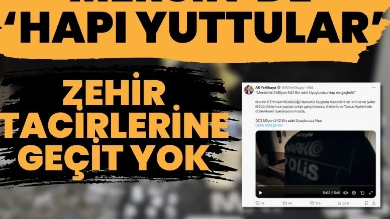 İçişleri Bakanı Ali Yerlikaya, Mersin'de gerçekleştirilen uyuşturucu operasyonlarında 3 milyon 542 bin uyuşturucu hapın ele geçirildiğini, 8 şüphelinin yakalandığını duyurdu.