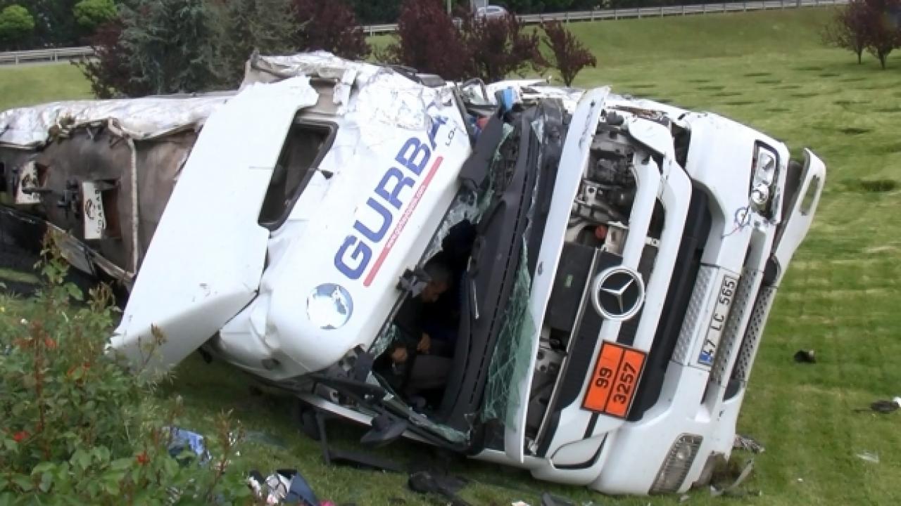 TEM Otoyolu Çatalca Gişeler Mevkii'nde virajı alamayan tanker devrildi. Devrilen tankerdeki zift çevreye yayıldı.
