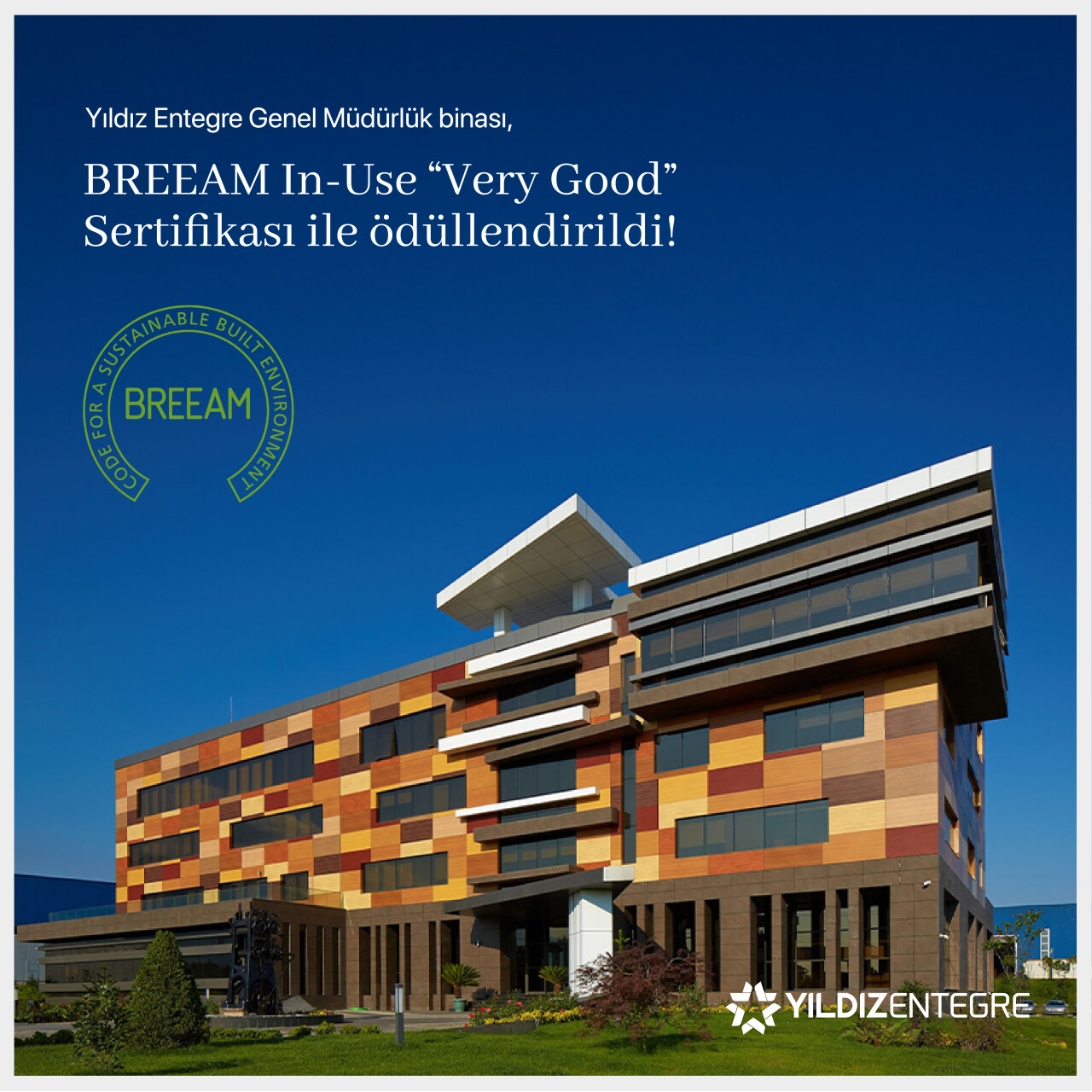 Yıldız Entegre, sürdürülebilirlik hedefleri doğrultusunda önemli bir adım atarak, Genel Müdürlük Binası ile uluslararası standartlara uygun bir başarıya imza attı. İngiltere merkezli Building Research Establishment (BRE) tarafından geliştirilen BREEAM In-Use sertifikasıyla binanın çevre dostu yapısı tescillendi. Yıldız Entegre, bu sertifikayı “Yapı Performansı” ve “Bina Yönetimi” olmak üzere iki farklı kategoride alarak, “BREEAM Very Good” (Çok İyi) derecesine layık görüldü.
