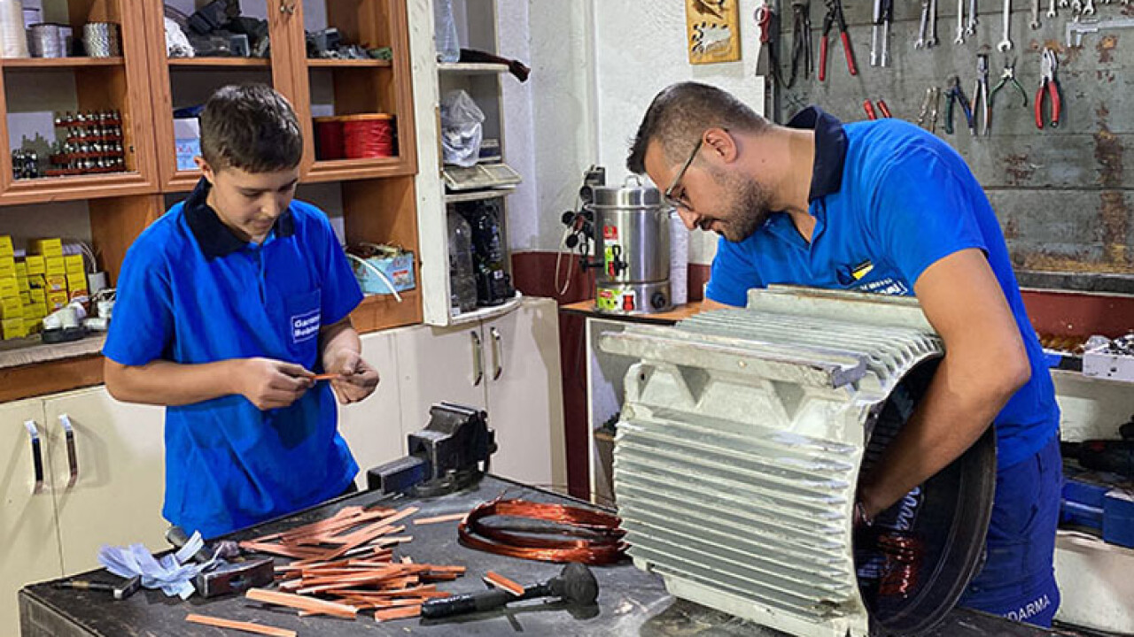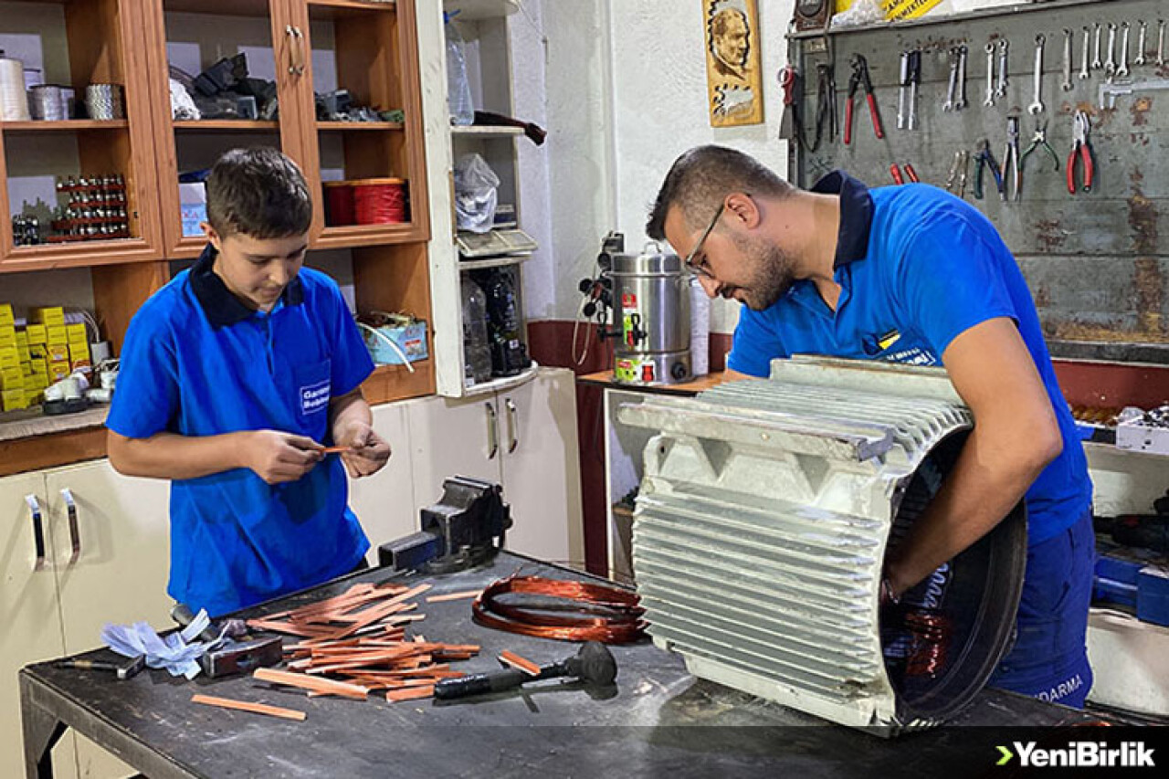 Hem okulda teorik bilgi öğrendiğini hem de iş yerinde uygulamalı eğitim aldığını belirten Çakır, "Sabah 08.00'de gelip ustalarımı bekliyorum. Onlar geldikten sonra işe başlıyoruz. Öğrendiğim meslek çok güzel. Bize gelen yanık motorların arızalarını çözüyoruz. Elektrik hatasından mı başka hatalardan mı yandı onu kontrol edip, tamir ve bakımını yapıyoruz." dedi.