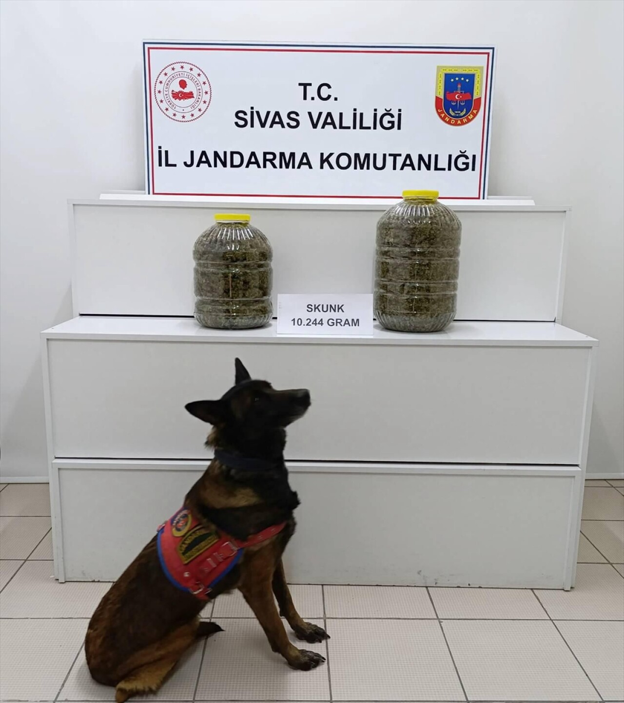 Otobüste uyuşturucu madde arama köpeği "Zanka"nın da katılımıyla arama yapan ekipler, yolculardan H.K'ye (50) ait çantadaki bidonlarda 10 kilo 244 gram skunk maddesi ele geçirdi.