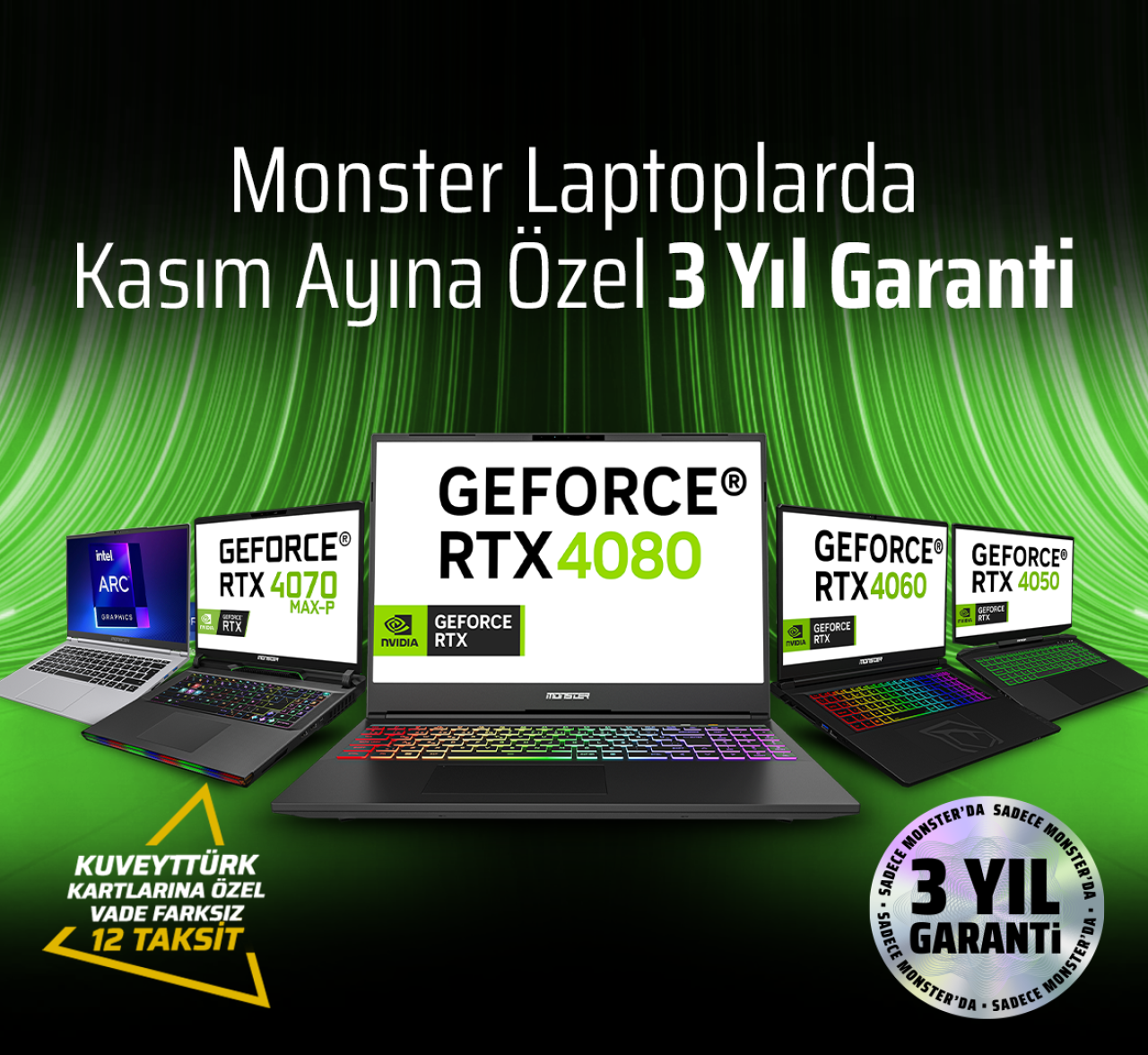 Yenilikçi teknolojiye sahip olmak isteyen kullanıcılar, Monster Notebook’un kasım ayında hayata geçirdiği kampanya ile benzersiz fırsatlardan yararlanabiliyor. Kampanya kapsamında seçili Abra, Tulpar,Semruk, Markut ve Huma modellerine limit sınırlarına takılmadan sahip olunabiliyor. Kalite ve güçlü performansın temsilcileri ürünler, RTX 4050, RTX 4060, RTX 4070 ve RTX 4080 ekran kartlarıyla dikkatleri üzerinde topluyor. Hem oyunculara hem de meslek profesyonellerine eşsiz bir fırsat sunan kampanyanın en can alıcı noktası ise sadece Monster Notebook kullanıcılarına özel 3 yıllık garanti seçeneği ve Kuveyt Türk kart sahiplerine özel vade farksız 12 taksit imkanı oluyor.