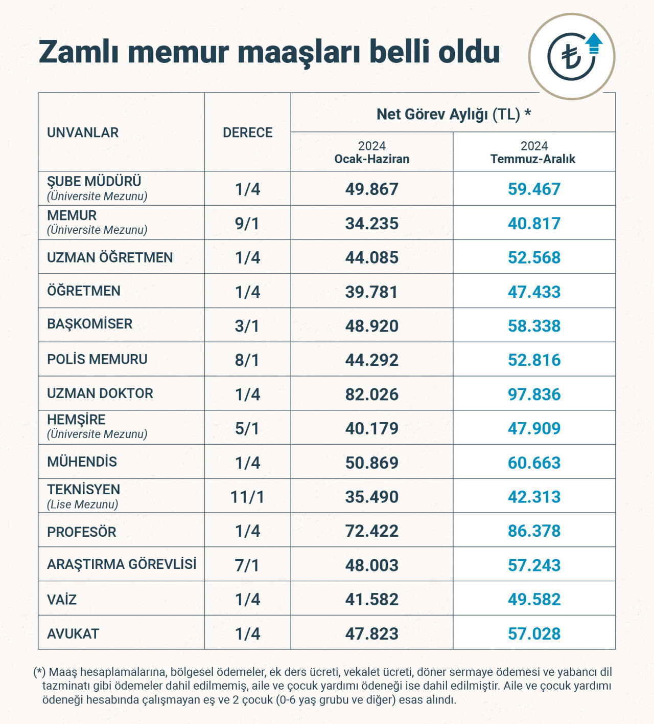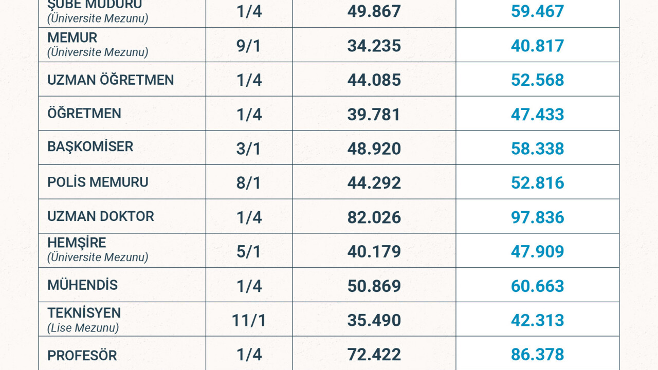 Bu çerçevede aile yardımı ödeneği dahil en düşük memur maaşı 32 bin 861 liradan 39 bin 177 liraya, en düşük memur emekli aylığı 14 bin 741 liradan 17 bin 587 liraya yükseldi.